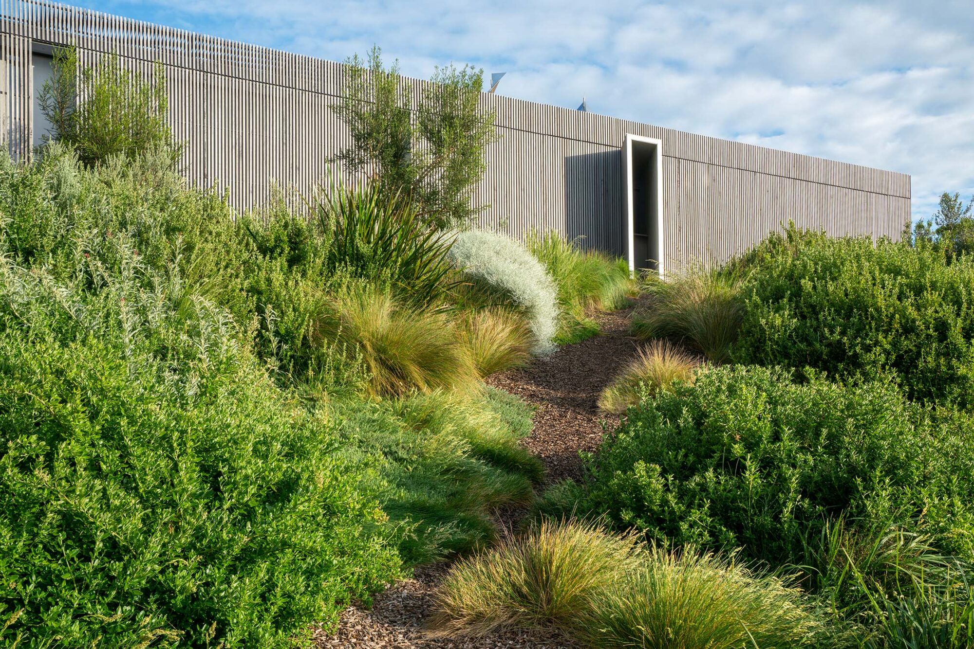 This project was a genuine opportunity to blur all lines between a sculptural building, a designed landscape and the broad topography of a coastal dune system. Our clients were unflinching in their commitment to a purely indigenous plant palette. The ‘House on the Coast’ is embedded in the side of a steep dune, requiring extensive excavation and disturbance to existing vegetation and soil during the build. Our brief was to heal the wound and re-habilitate the site, allowing the building to interact with Nature as it was designed to do. One wing of the L shaped house is nestled on the contour while the other cantilevers over the landscape, creating a sheltered habitat for regeneration. Here, grassed voids meander around ‘islands’ of existing coastal vegetation restored with new plantings. Mulched paths drift into places for camping, a fire pit and bush trampolining. The house is designed to respond to environmental rhythms as it opens and breathes in or closes and protects from the elements.